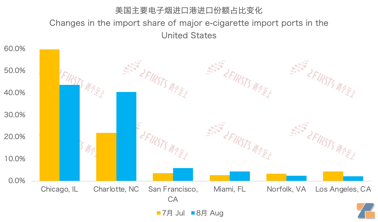8月,夏洛特口岸进口份额有明显增长,芝加哥与夏洛特口岸成为美国进口电子烟的两极。
