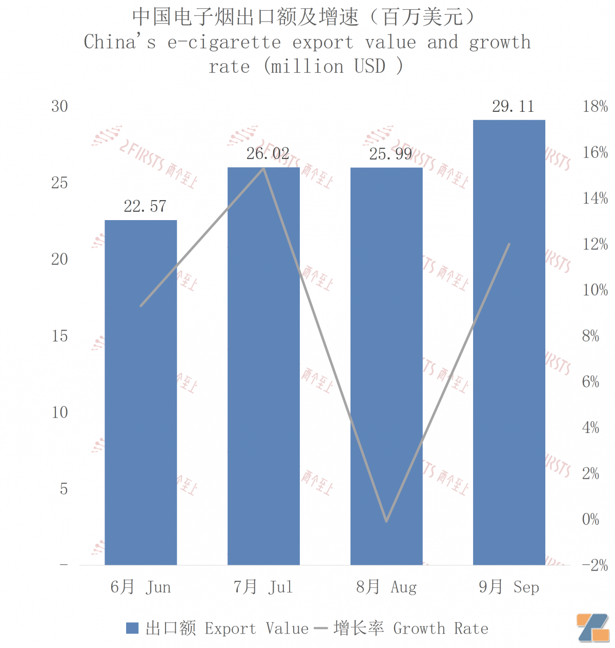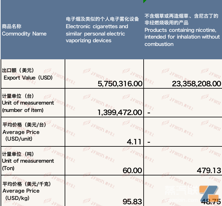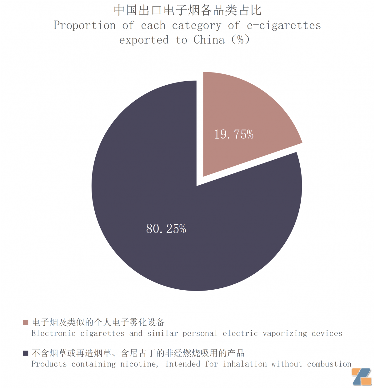 其中,“电子烟及类似的个人电子雾化设备”占出口品类的19.75%,而“不含烟草或再造烟草、含尼古丁的非经燃烧吸用的产品”占比80.25%。