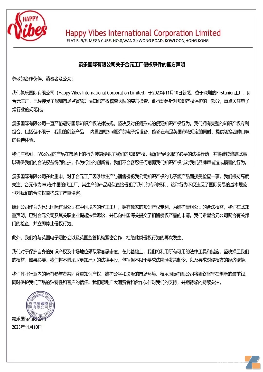 此外,氛乐国际还在声明中提到,已对合元公司及其关联企业提起法律诉讼,并已向中国海关提交了扣留侵权产品的申请,希望合元公司配合有关部门的检查,并立即停止侵权行为。