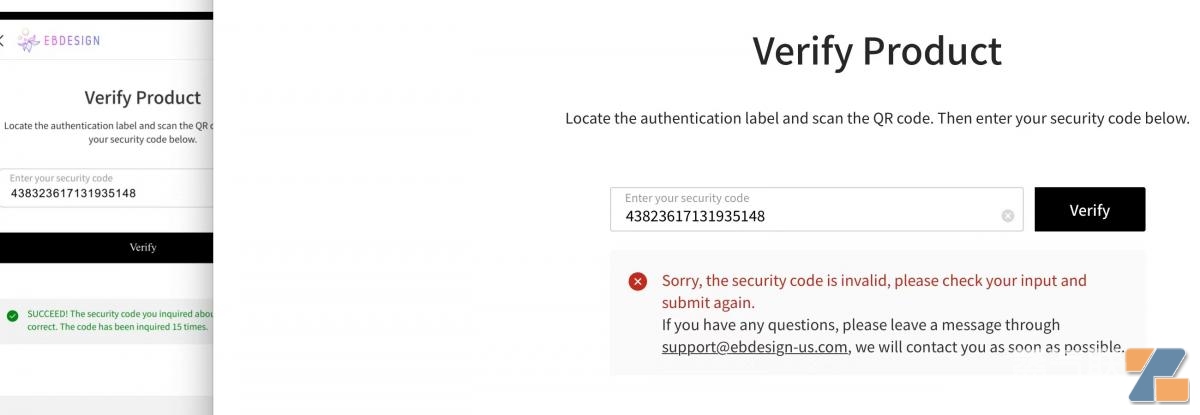 2FIRSTS将买到的“EBDESIGN”产品所提供的18位防伪码重新手动输入在EBDESIGN官方验证页面上,这一次则未能通过验证。|图源:EBDESIGN官方网站截图
