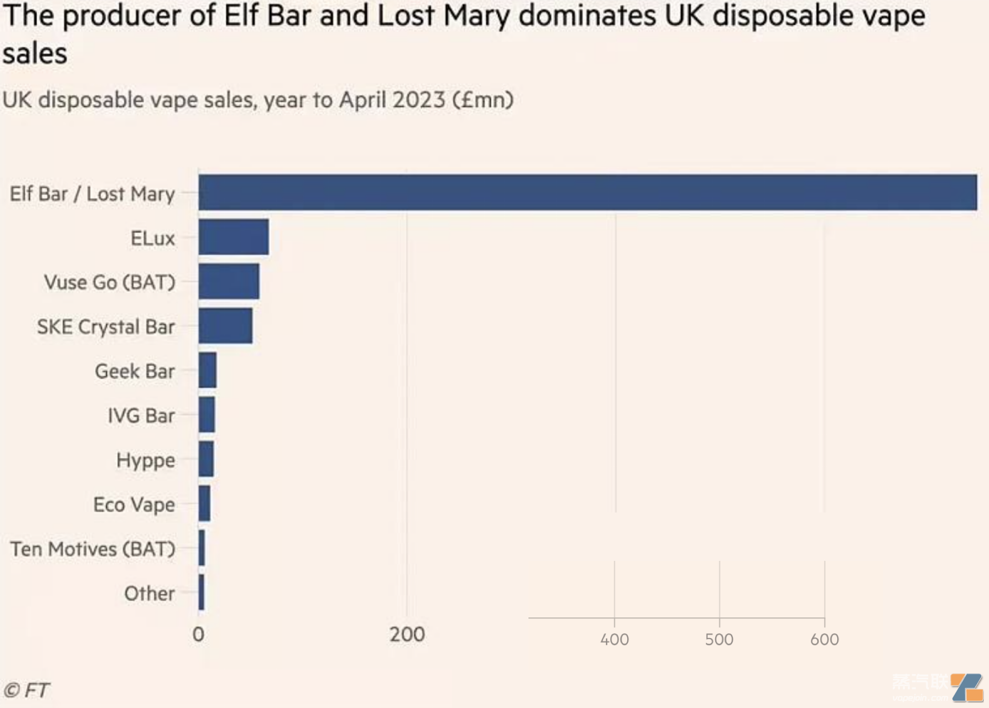 2023年4月,尼尔森公布英国一次性电子烟市场排名前10的品牌,其中waka与RELX均未上榜|数据来源:尼尔森