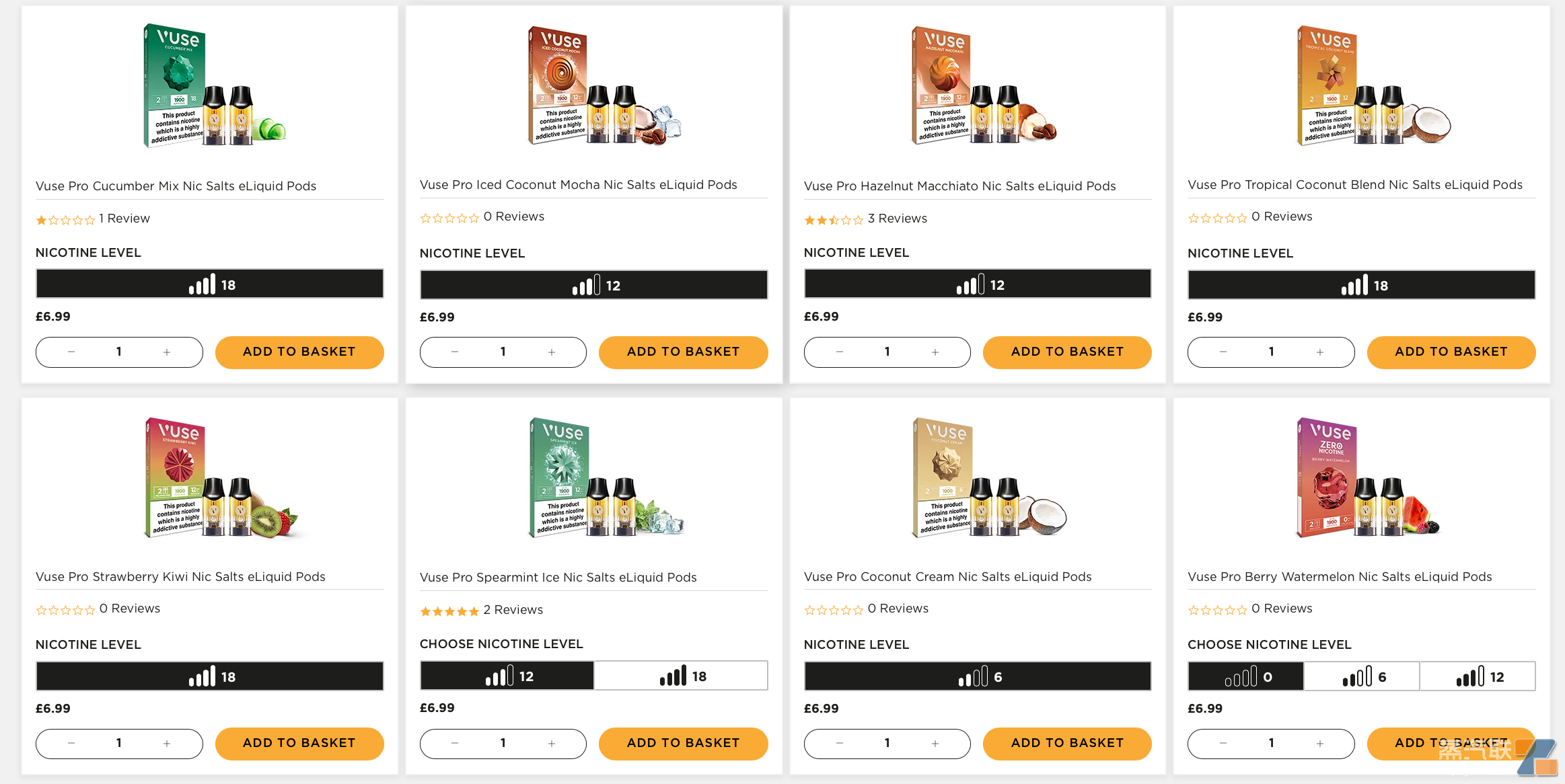 至于英美烟草旗下的VUSE,布阵则显得更为“气派”。其英国官方线上商店显示在售的烟油54款。规格以口数计,2支装1,900口烟油标价6.99英镑(约8.89美元),提供从零尼到18mg共5档尼古丁浓度的选择,更提供4.29英镑起(每包2支)的订购服务,每个月为顾客将烟油送货到府。