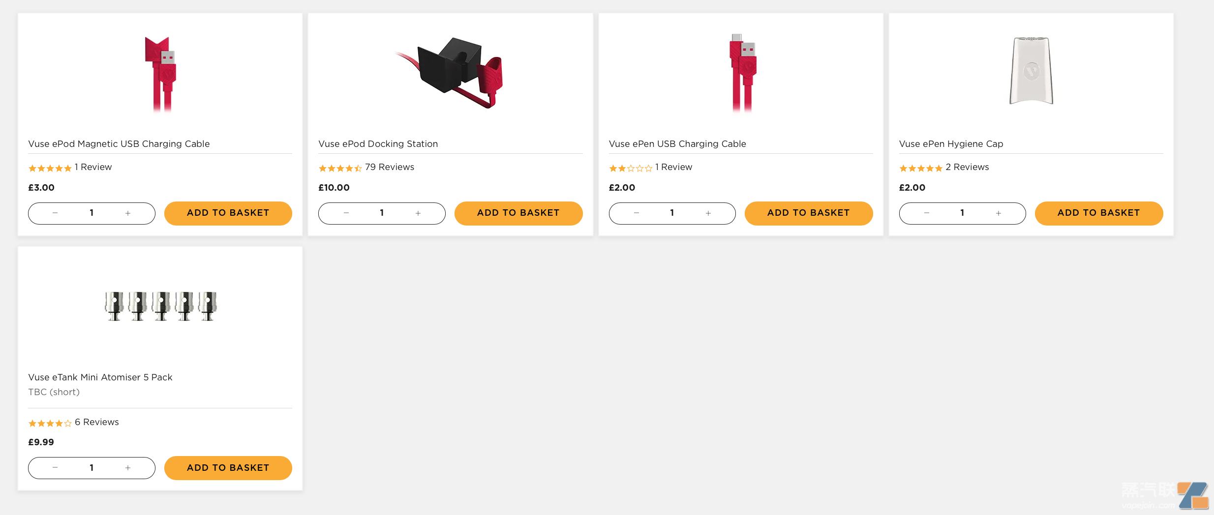 VUSE官网上的产品目录中,目前包含有“配件”这一选项,下面包括了例如充电线、置物座以及卫生滤嘴等。