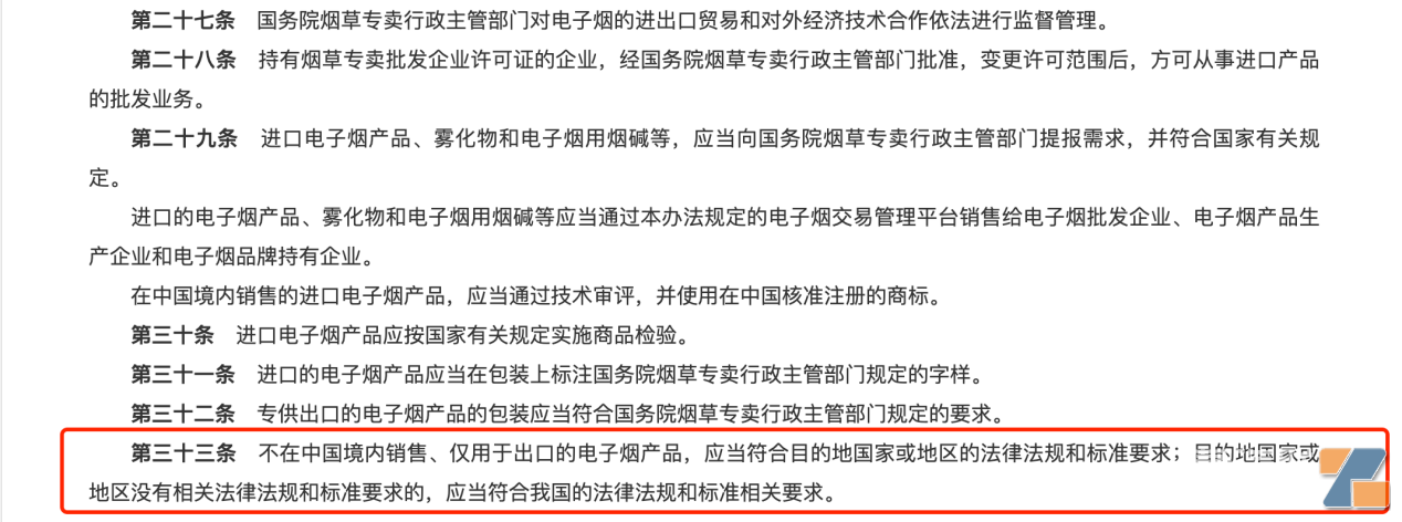 2FIRSTS从马来西亚检测机构了解到,马来西亚政府对电子烟的监管仅限于“设备”,而并没有对“含尼古丁的烟油”设置法规。但依据国家烟草专卖局公告在2022年3月11日下发的《电子烟管理办法》第三十三条规定:不在中国境内销售、仅用于出口的电子烟产品,应当符合目的地国家或地区的法律法规和标准要求;目的地国家或地区没有相关法律法规和标准要求的,应当符合我国的法律法规和标准相关要求。