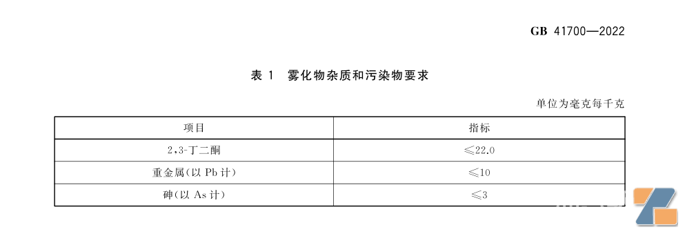 依据2022年10月1日正式实施的中国《电子烟》强制性国家标准具体条款,2FIRSTS发现,在“雾化物中允许使用的添加剂及最大使用量”中并未包含丁二酮,但在附录中“雾化物杂质和污染物要求”中有关“2,3丁二酮”的指标为22mg/kg。